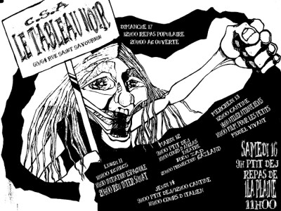 Le tableau noir est toujours la...Ni les volontés politiciennes ni les pressions policières n'auront raison de notre volonté de continuer a créer et résister. Alors cette semaine encore venez participer aux ateliers ,boire un café,apporter votre soutient d'une façon ou une autre... Samedi prochain se tiendra peut être le dernier concert du lieu alors venez y'a de la place pour accueillir du monde. Restons sauvages C.S.A la tableau noir 64 rue st Savournin 13001 MARSEILLE!Le Tableau Noir est toujours là…Ni les volontés politiciennes ni les pressions policières n’auront raison de notre envie de continuer à créer et résister. Alors cette semaine encore, en attendant des nouvelles de la préfecture, venez participer (et bien sur proposer…) aux ateliers, aux projections, prendre le café, manger, apporter votre soutien d’une manière ou d’une autre… Samedi prochain se tiendra peut-être le dernier concert du lieu alors venez nombreux et nombreuses y’a de la place pour vous accueillir…