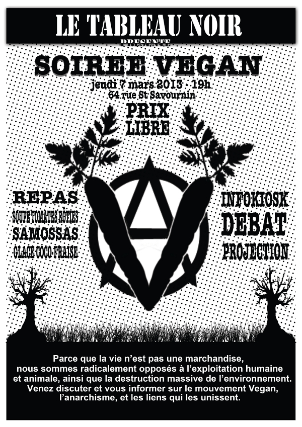 Voilà, jeudi soir encore une soirée au tableau noir venez manger, discuter, vous informer, sur le véganisme, l’anarchisme et les réalités de l’exploitation animale et humaine.