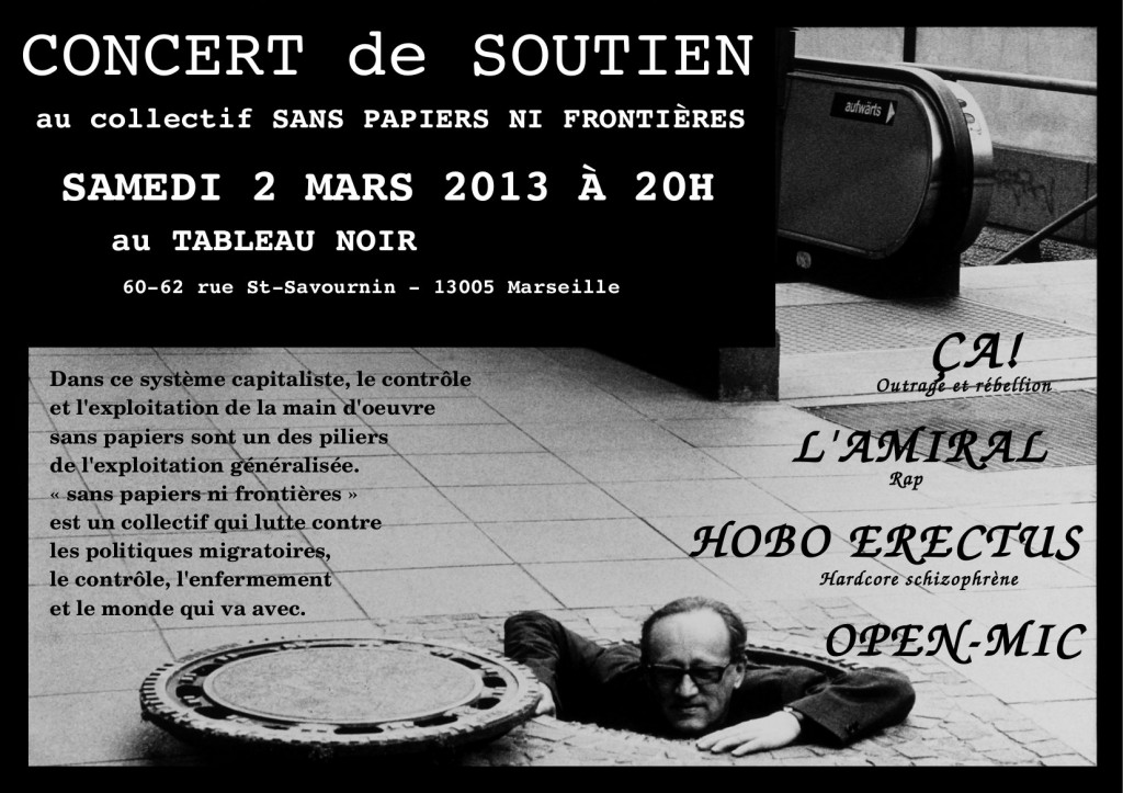 Le tableau noir et le collectif sans papiers organisent un concert de soutient demain soir pour aider à  pouvoir continuer a lutter contres toutes les prisons et le système qui les crée…Alors venez écouter de la musique,discuter des révoltes passées,présentes et futurs au Centre Social Autogéré le tableau Noir a partir de 20H
