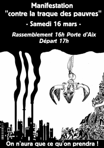Depuis le 16 janvier, nous sommes expulsables. Sachant cela, nous avons augementé la fréquence de nos activités avec des cantines les jours de marché, des projections deux fois par semaine, des nouveaux ateliers (pochoir, tricot/couture, des stages de self défense et d’autres). Il y a deux semaines, nous avons reçu la visite de Patrick Menucci, maire du 1er arrondissement de Marseille, qui sous prétexte que c’était son école, nous a ordonné d’ouvrir… Nous lui avons refusé l’accès en lui expliquant qu’il pouvait, comme tout le monde, venir manger avec nous Dimanche au repas de quartier. Il est reparti visiblement en colère en nous menaçants de nous faire expulser dans la semaine. Après une nouvelle semaine de cantines et d’activités, aucune nouvelle. Le samedi 9 Février, nous décidons d’organiser un barbecue pour tous sur la Plaine. Très rapidement, la Police Municipale arrive en expliquant que c’est interdit et qu’on doit arrêter et partir. On explique qu’on ne fait rien de mal et que nous ne voyons pas pourquoi nous devrions partir. Les choses dégénèrent rapidement lorsqu’un des policiers venus en renfort tente de renverser le grill avec tout le monde agglutiné autour. Cafouillage, gazage à bout portant de plusieurs personnes, la BAC arrive sur les lieux en un temps record et regaze plusieurs persones. Résultat des courses, 6 jours d’ITT pour une amie, une arrestation suivie de 48 heures de garde à vue et d’une mise en examen pour outrage, rebellion et coups et blessures sur agent de la force publique. Il aurait réussi à causer à lui tout seul 6 jours d’ITT sur trois policiers.